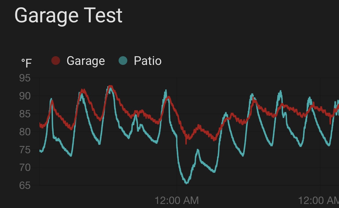 While getting some other work done on my house, I had my contractor blow about 14 inches of insulation in the attic. The graph above shows the past two weeks of temps in my garage. You can differentiate each day by the peaks. Over the past 5 days, you can see that the garage temp doesn’t swing so much from morning to evening or day to day. We’re in a fairly mild season right now so the real test will be those very cold and very hot days over the next year. I picked up a ventless propane heater this past spring during an end of season sale at Lowe’s (I’ll vent it anyway) and will be getting a window air conditioner. Looking forward to seeing how they do.